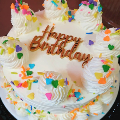 Cake de Vainilla horneado con chips de chocolate blanco de colores , relleno de chantilly y chips y cubierta con chantilly