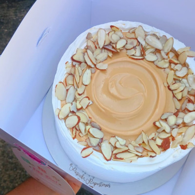 Cake suave, cubierto con una crema chantilly de vainilla aireada y sedosa. En su interior, un relleno de arequipe que se derrite delicioso en cada bocado. La decoración con láminas de almendras hace el balance perfecto entre textura y sabor.